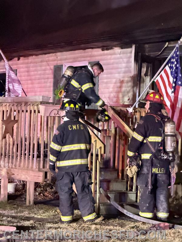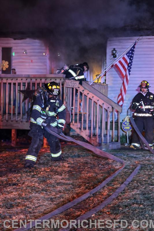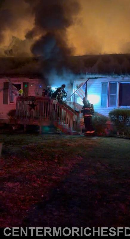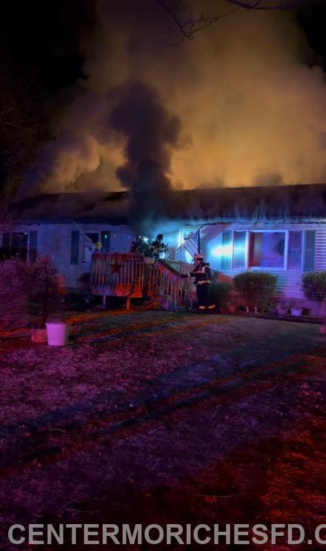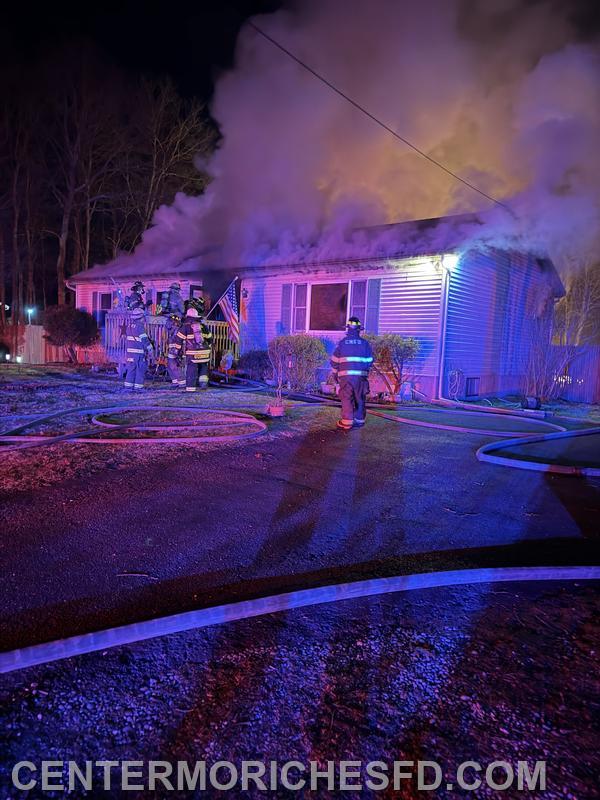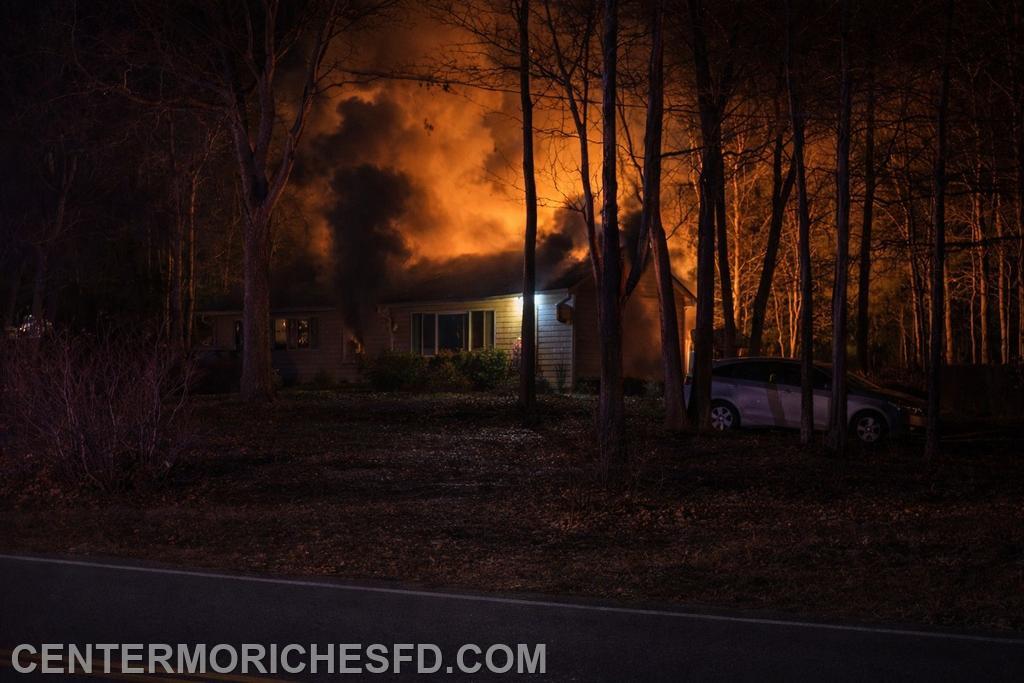 | Just before midnight, Center Moriches firefighters were dispatched to a reported house fire on Railroad Avenue near Pete’s Path. Upon arrival, crews found a single-story home with fire showing in the rear of the structure. Firefighters quickly went to work to contain the fire and prevent further extension.