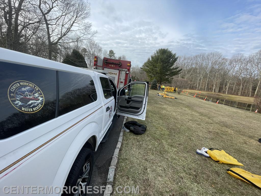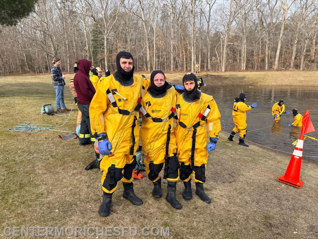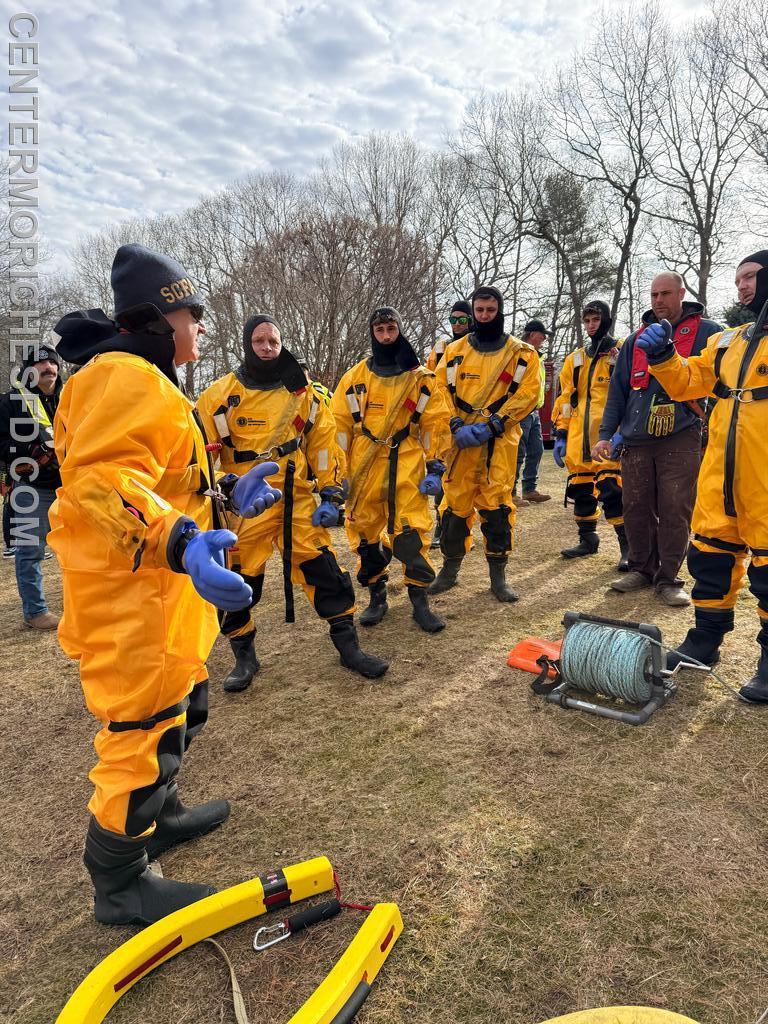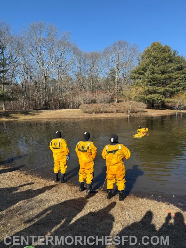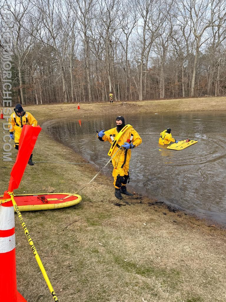 | This morning, the Center Moriches Fire Department Water Rescue Team stood by as the dedicated safety team for Manorville FD’s annual ice rescue training.